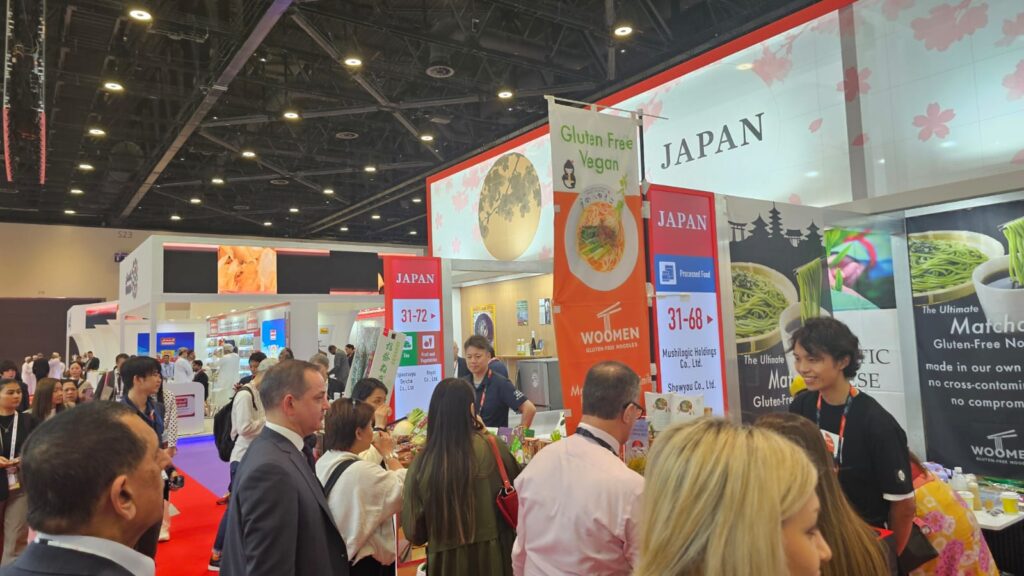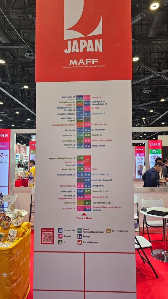 第一に、JETROが主催するJapan Pavilionへの出展です。ここでは多くの中小企業が加工食品や調味料などを展示し、現地ディストリビューターとの商談を中心とした活動が行われていました。これは、中東市場への初期参入においてディストリビューターを通じて販路を確保するモデルが依然として有効であることを示しています。